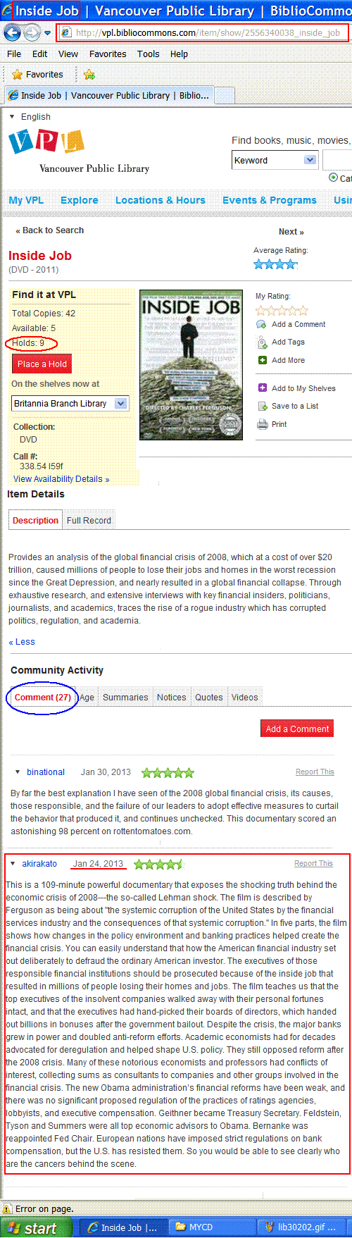 The following DVD describes the mindset of the top financial managers in North America. As you see, this DVD is in a big demand 'cause nine people are waiting to see this DVD at Vancouver Public Library.